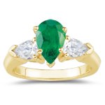 This entrancing Three Stone Emerald and Diamond Ring beholds an AAA quality pear shaped Emerald, ornate with two radiant pear-shape Diamonds prong set in 18K Yellow Gold. Approximate Gemstone Weight: 0.31 Carats. Approximate Diamond Weight: 0.20 Carats. This product is sold by JEWELS BY SABRINA.,SHAPE:Pear,SHAPE:Pear,METAL:18K Gold,SETTING STYLE:Prong Setting,SETTING STYLE:Prong Setting,MINIMUM CARAT TOTAL WEIGHT:0.2,MINIMUM CARAT TOTAL WEIGHT:0.31,MINIMUM COLOR:H,MINIMUM CLARITY:VS,GEMSTONE DIMENSIONS:6x4 mm,GEMSTONE:Emerald,COLOR:Green,ACTUAL METAL:18K Yellow Gold,NUMBER OF DIAMONDS:2,AVERAGE COLOR:Green,AVERAGE QUALITY:AAA,NUMBER OF STONES:1